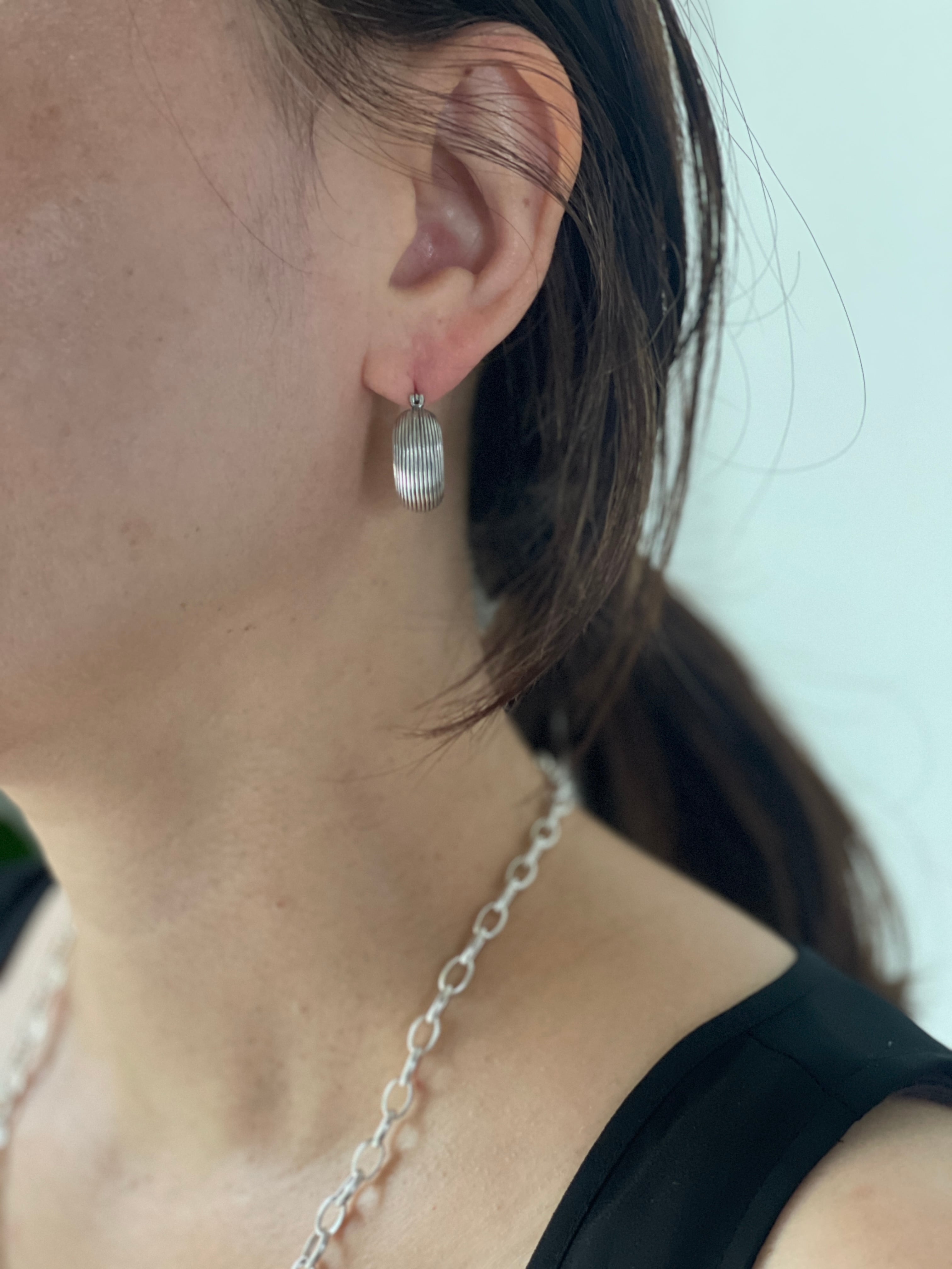 素材: シルバー925 サイズ:18mm×20mm / 厚み4mm 細いラインを均等に入れ、燻した後に粗して凹凸が引き立つ立体的なデザインにしています。 ボリュームはあるが、なるべく軽くなるようにデザインに支障が出ないくらいのバランスで容量を調整しています。 耳元をポイントにしたいスタイルの時にオススメです。