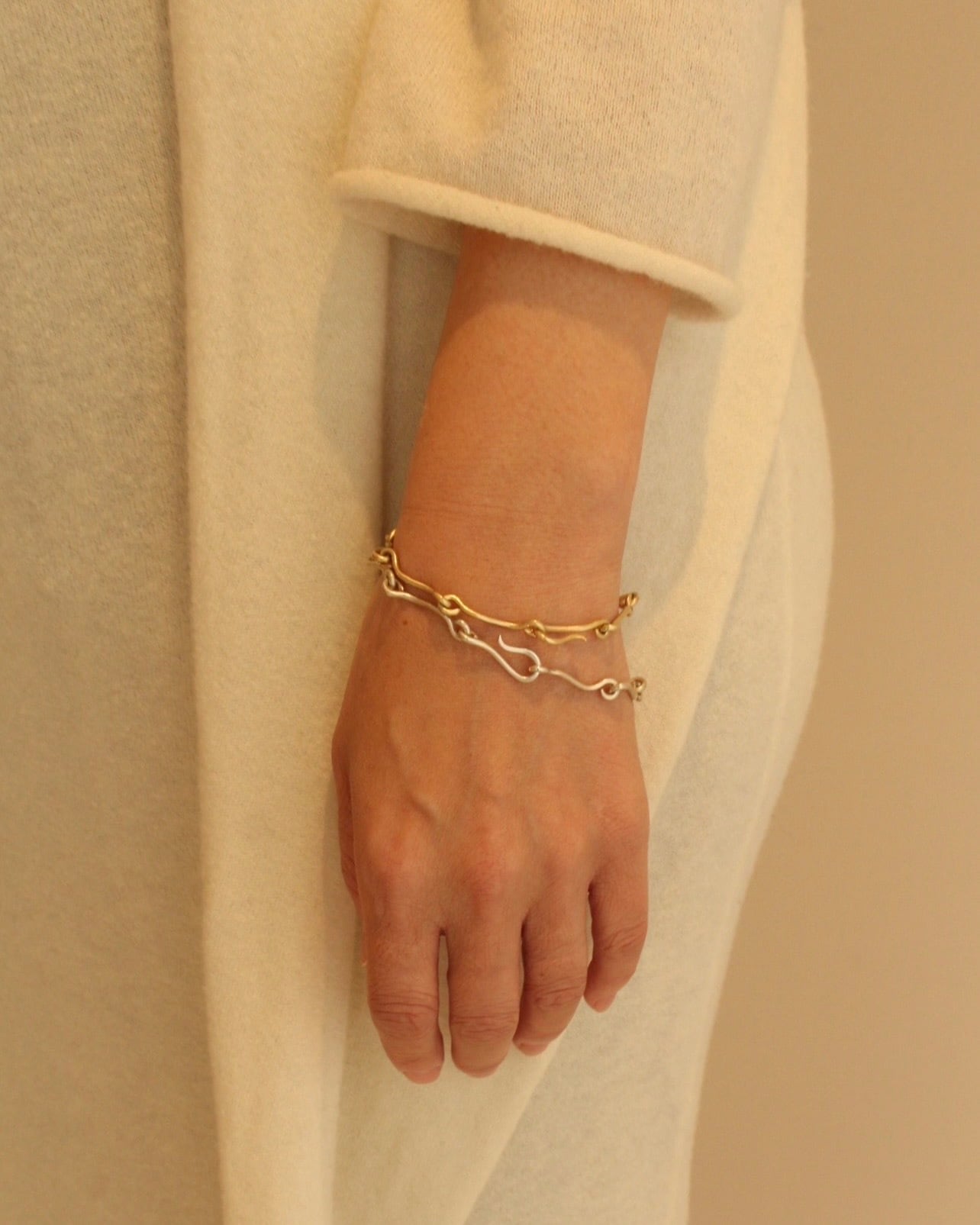 素材: シルバー925 / gp サイズ: 17cm / 19cm Waveシリーズのチョーカーと同じデザインのブレスレット。手元の袖口から見えるデザインがさりげなく、程よい存在感となります。