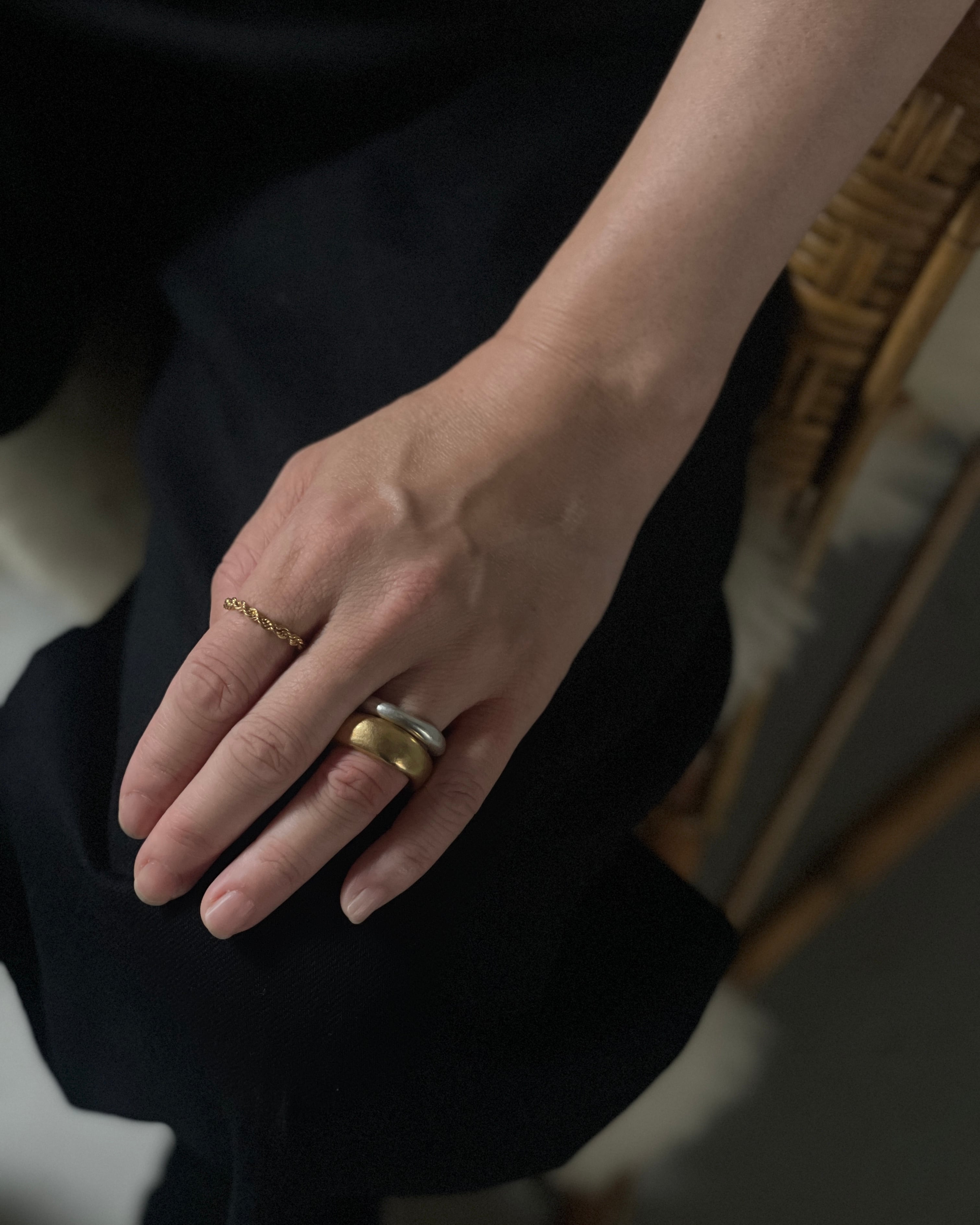 素材: シルバー925 / ゴールドプレーテッド サイズ: 幅25mm / S,M,L,XL ロープチェーンを用いたシンプルなリング。 重ね付けやお手持ちのアイテムとの組み合わせでお楽しみ頂けます。 -サイズチャート- M:8-9号 L:10-11号 XL:13-14号 XXL:15-16号 *ピッタリサイズではなく1サイズアップを推奨いたします。 お手持ちのリングをストッパーにしてレイヤードをお楽しみください。