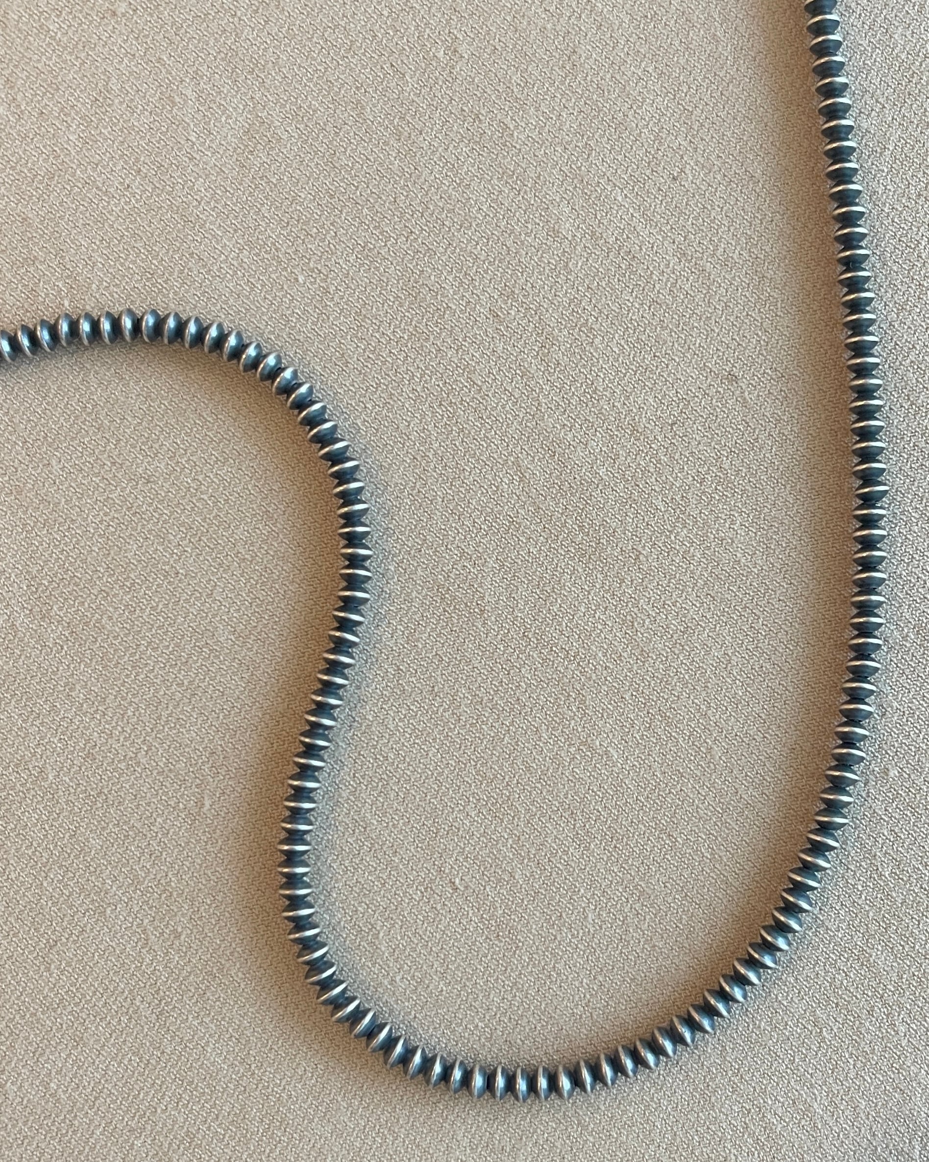 素材:シルバー925 サイズ:3mm珠 61cm 小さなそろばん型の3mm珠を連にしたネックレス。 ナバホ族による伝統的なデザインです。 予め、燻がかかった凹凸感がヴィンテージのような雰囲気を醸し出しています。 現代のネイティブ・アメリカンによるハンドメイドになります。