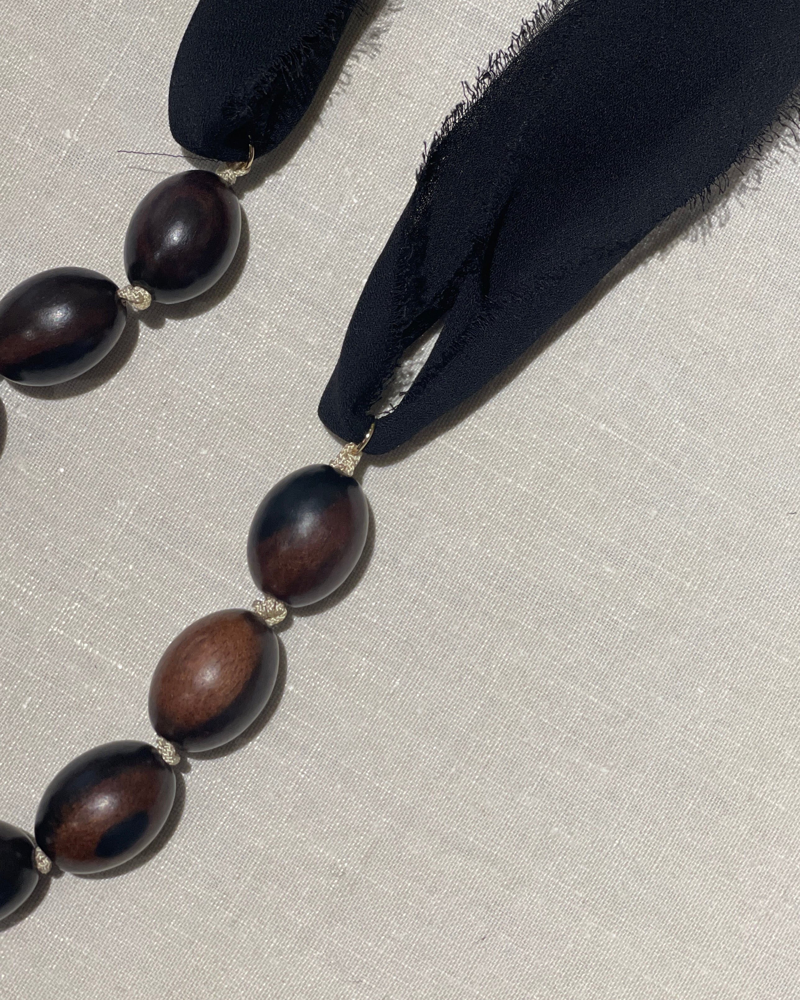 素材:ウッド / シルクコード サイズ: ウッド約2cm×1.3cmをベージュの糸でノット仕上げにしています。 シルクリボン 幅 約3cm、長さ48cmのダブルが両サイドに2本セットしてあります。 シルクジョーゼットのリボンは横はステッチが入りフリンジ加工になっています。先端はカットオフになるので、ほつれてきます。 自然な風合いをお楽しみください。 リボンは短くしたり、長めにしたり、スタイリングにより調節してお楽しみください。