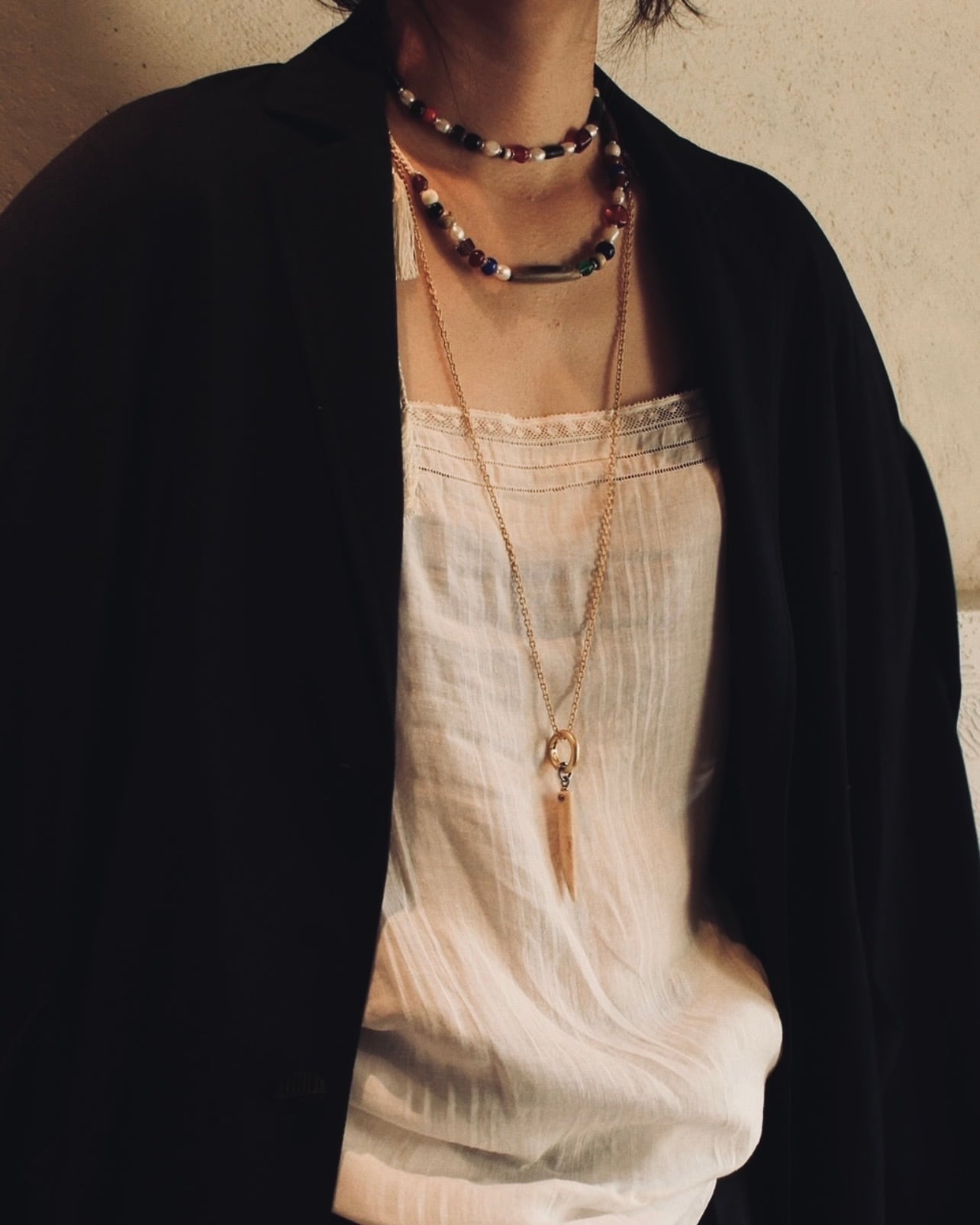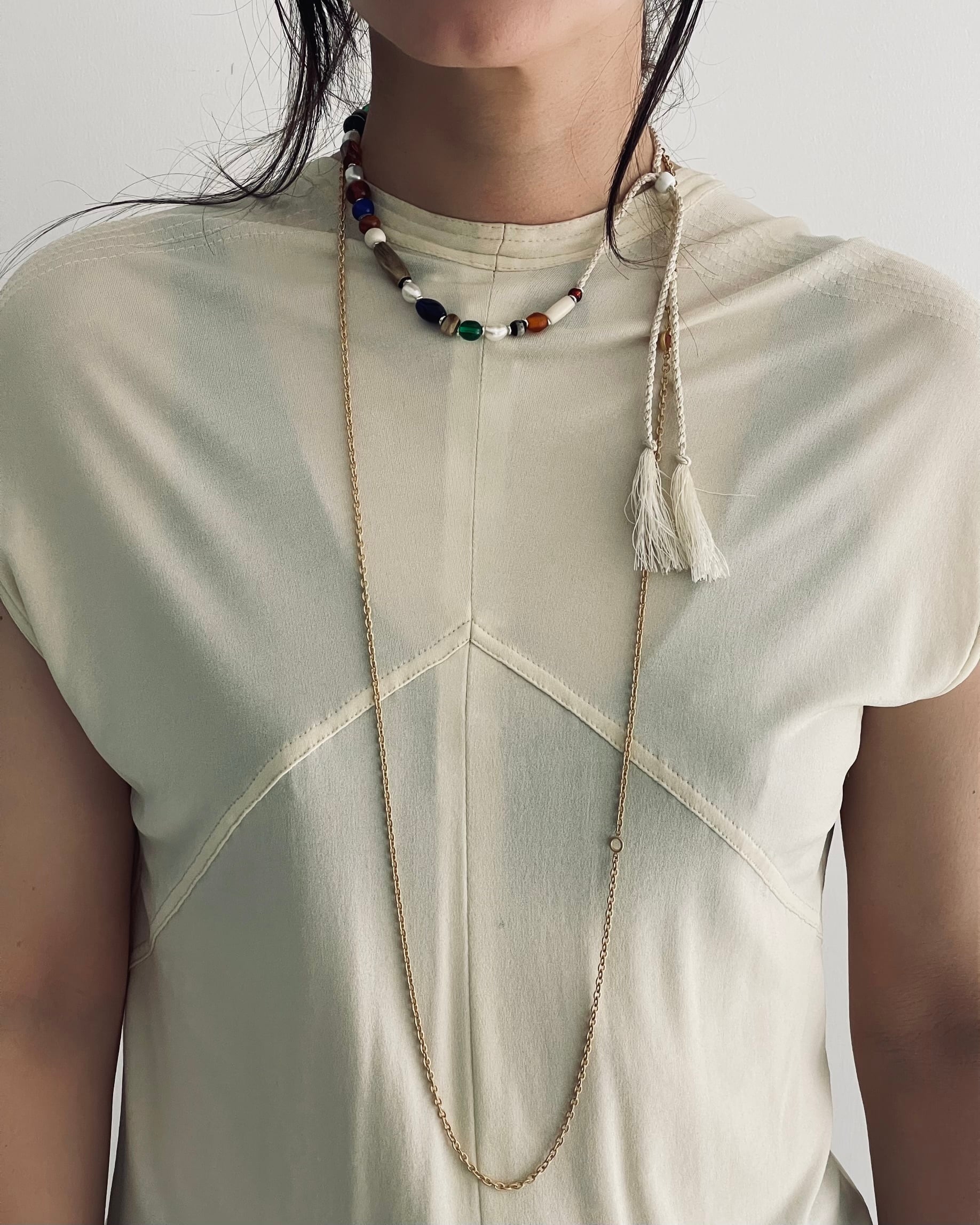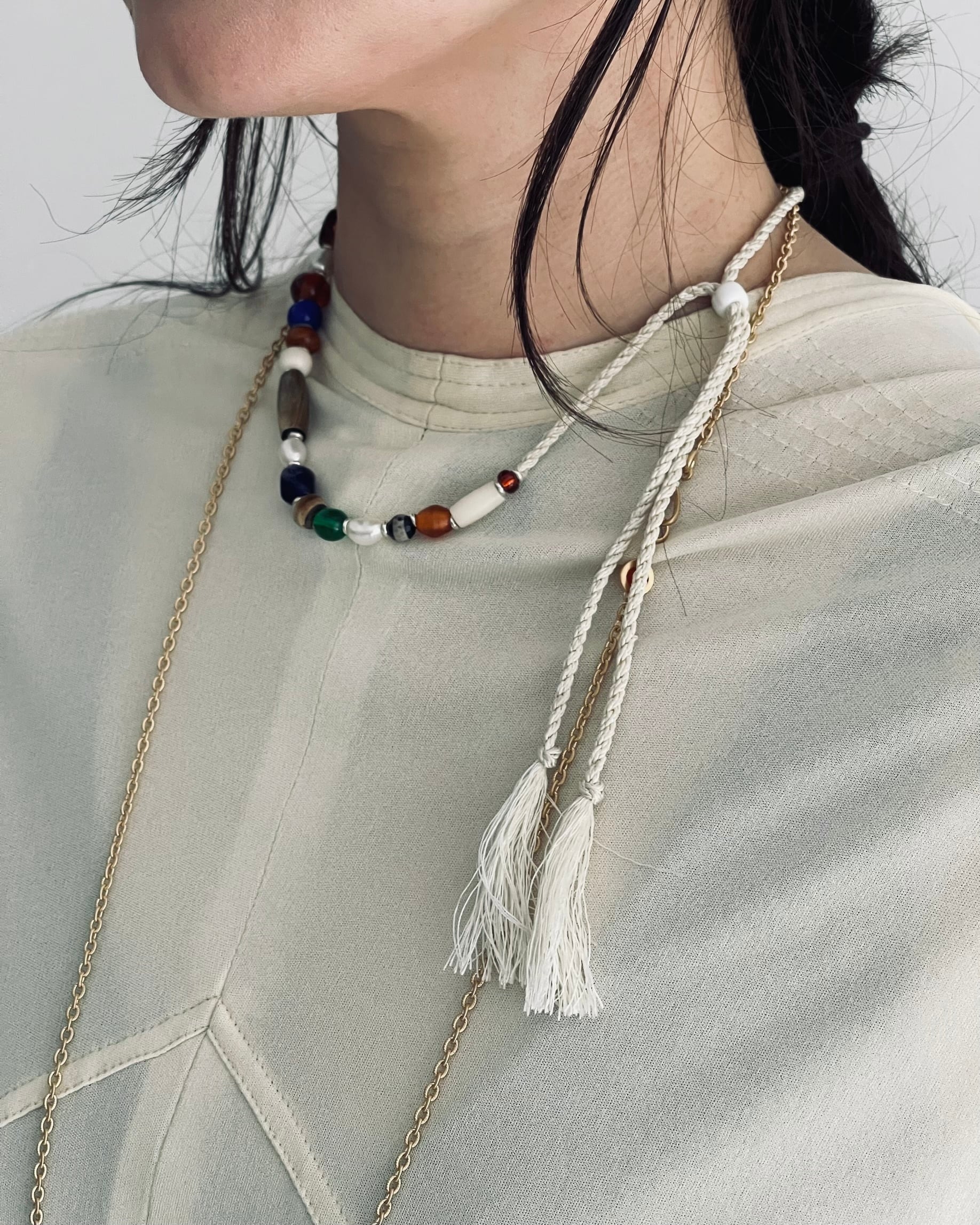 スタイリングによって、モードにしたり、トライヴァルなイメージにしたりと楽しめるネックレスです。