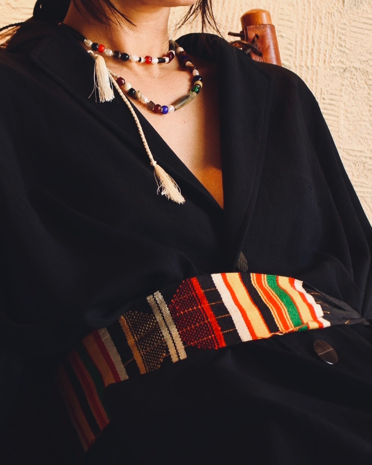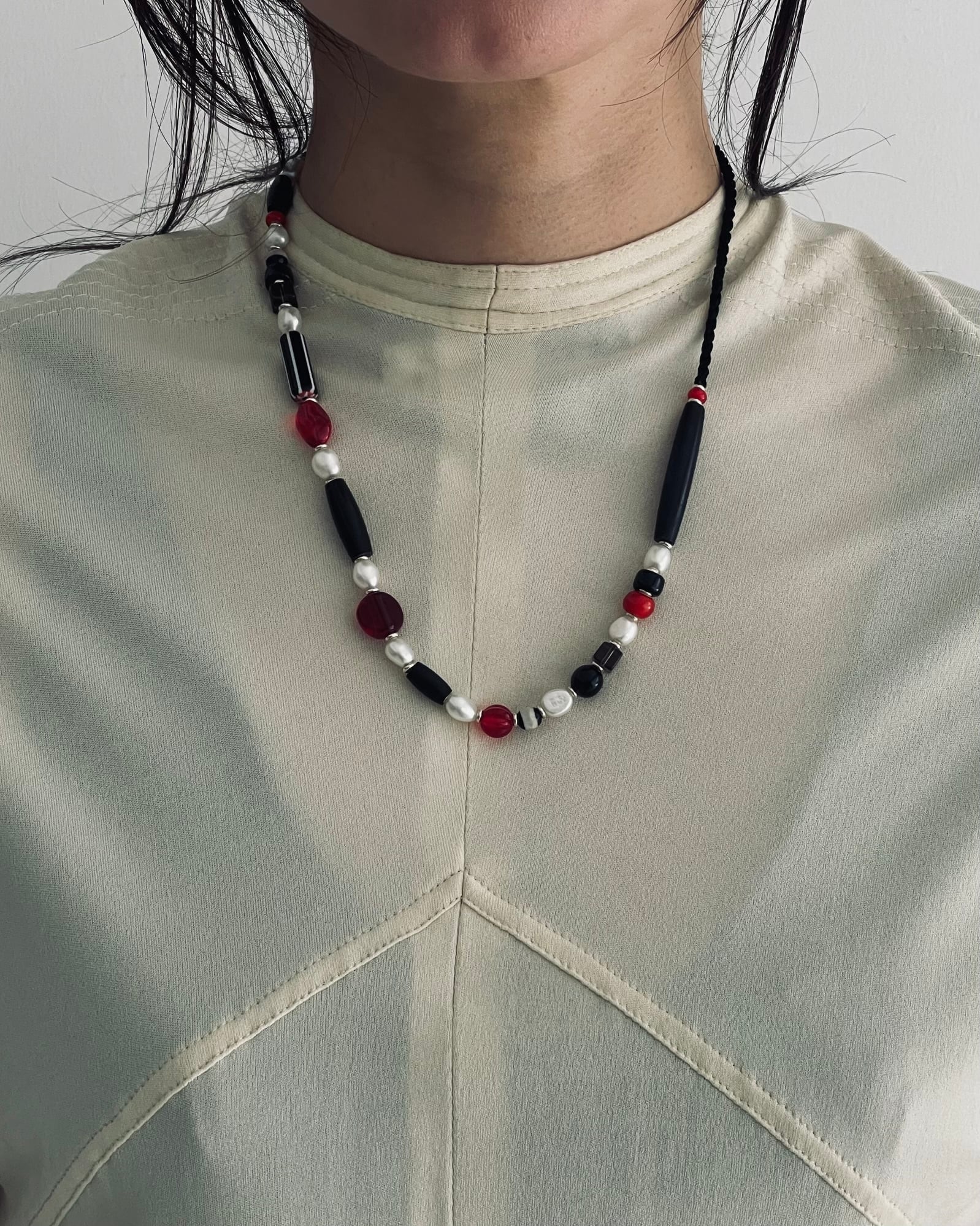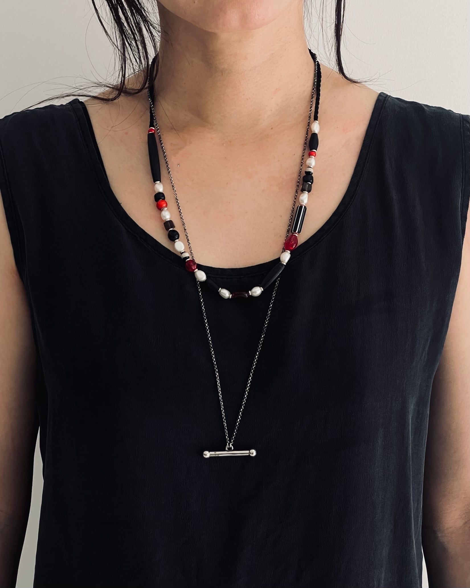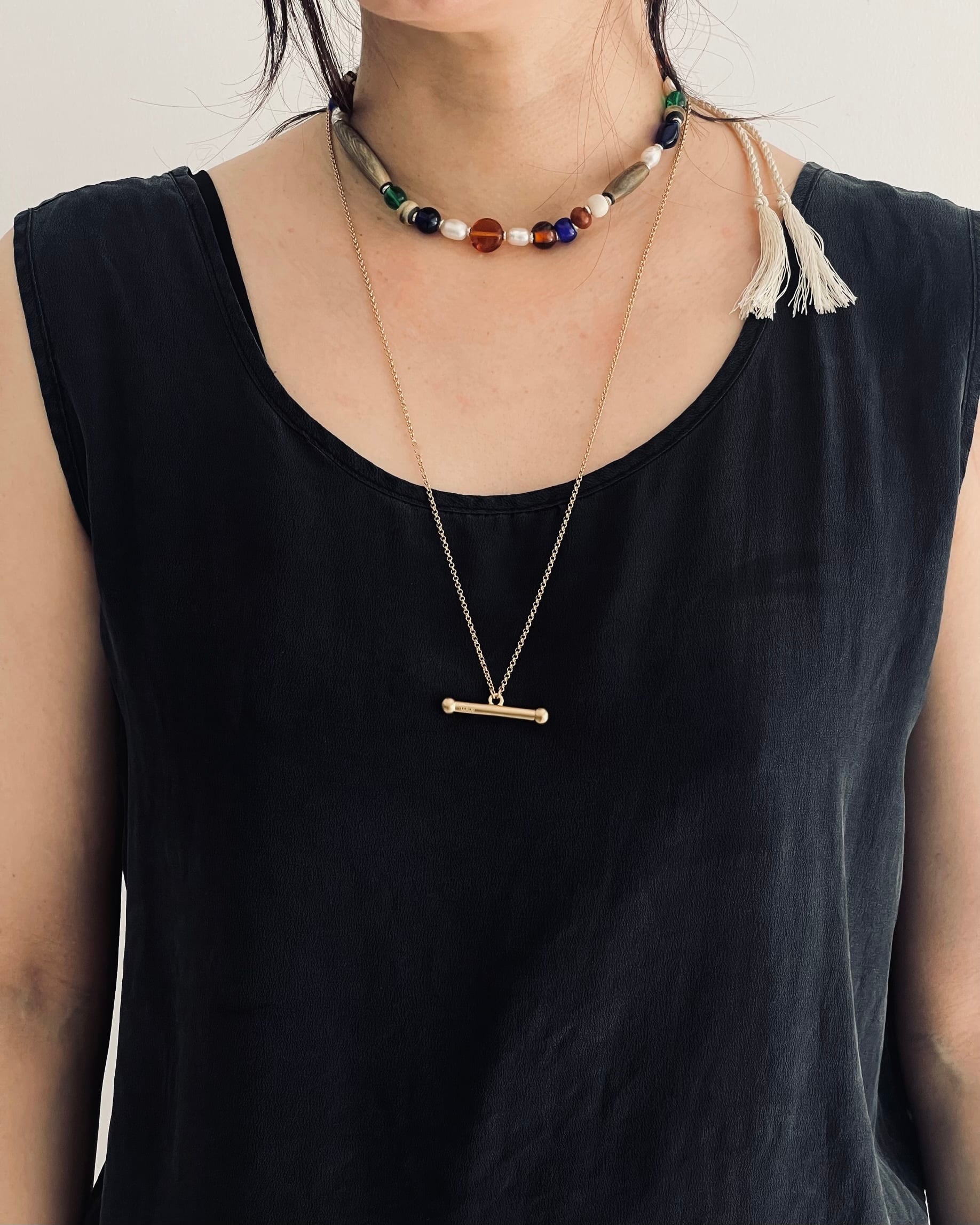 スタイリングによって、モードにしたり、トライヴァルなイメージにしたりと楽しめるネックレスです。