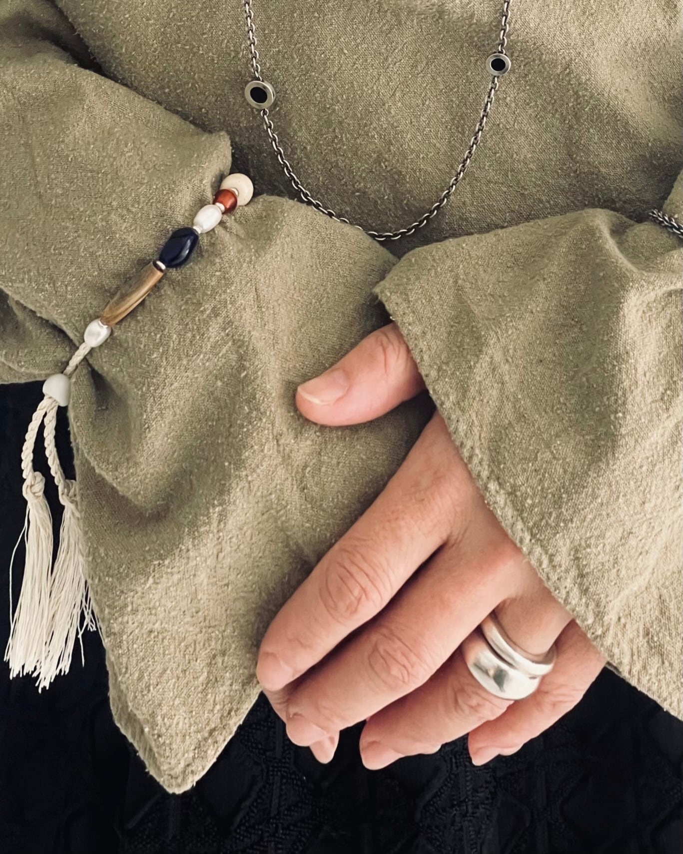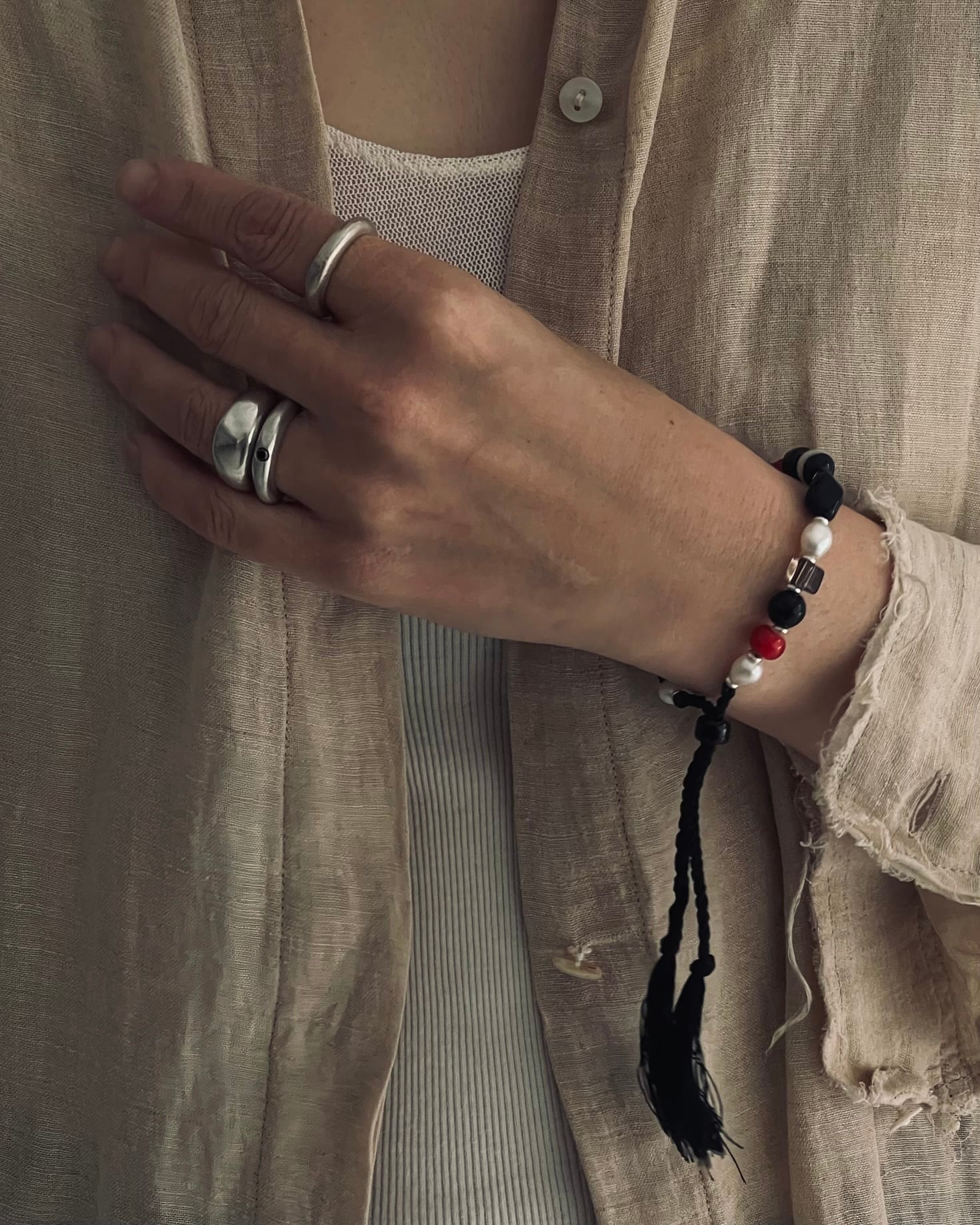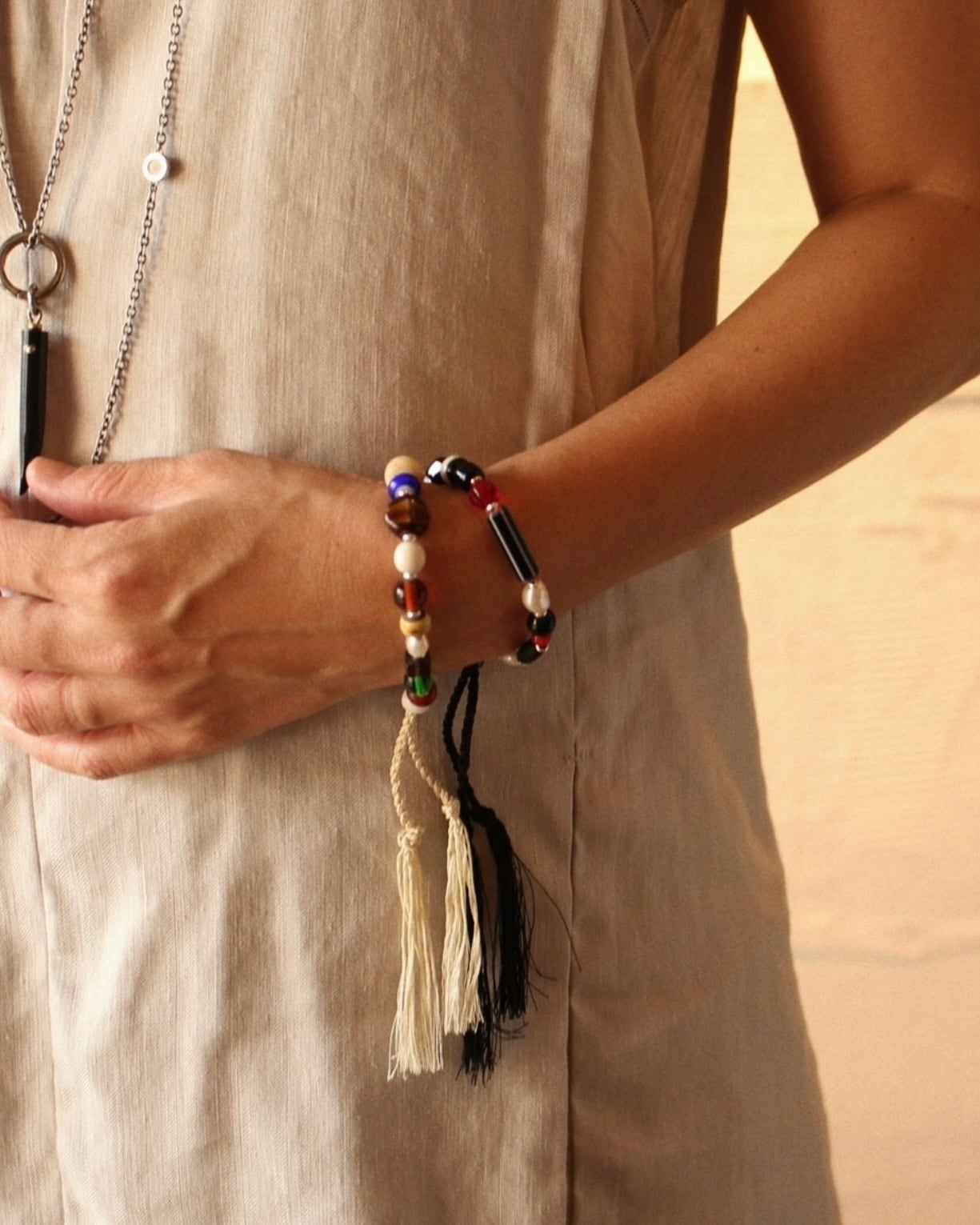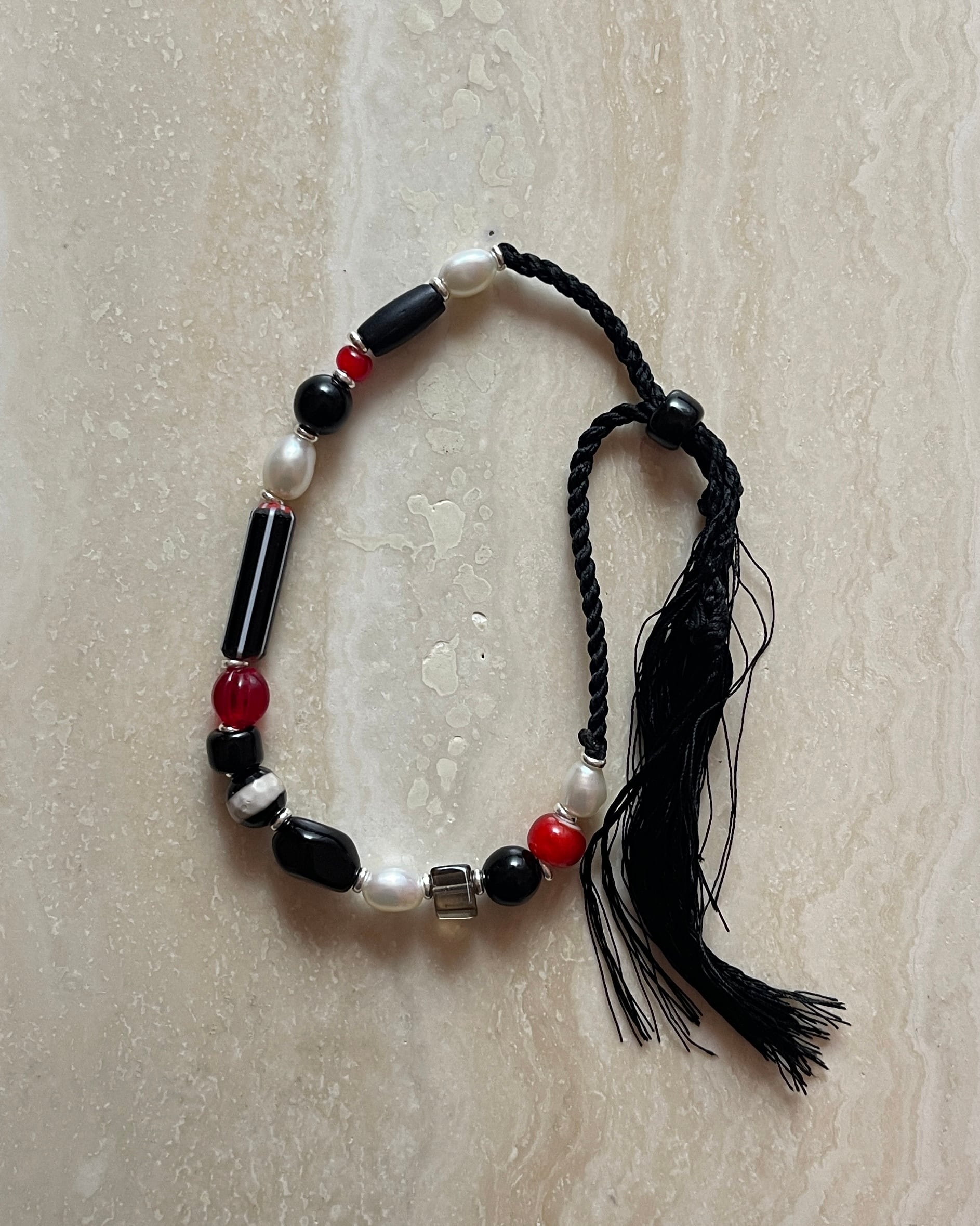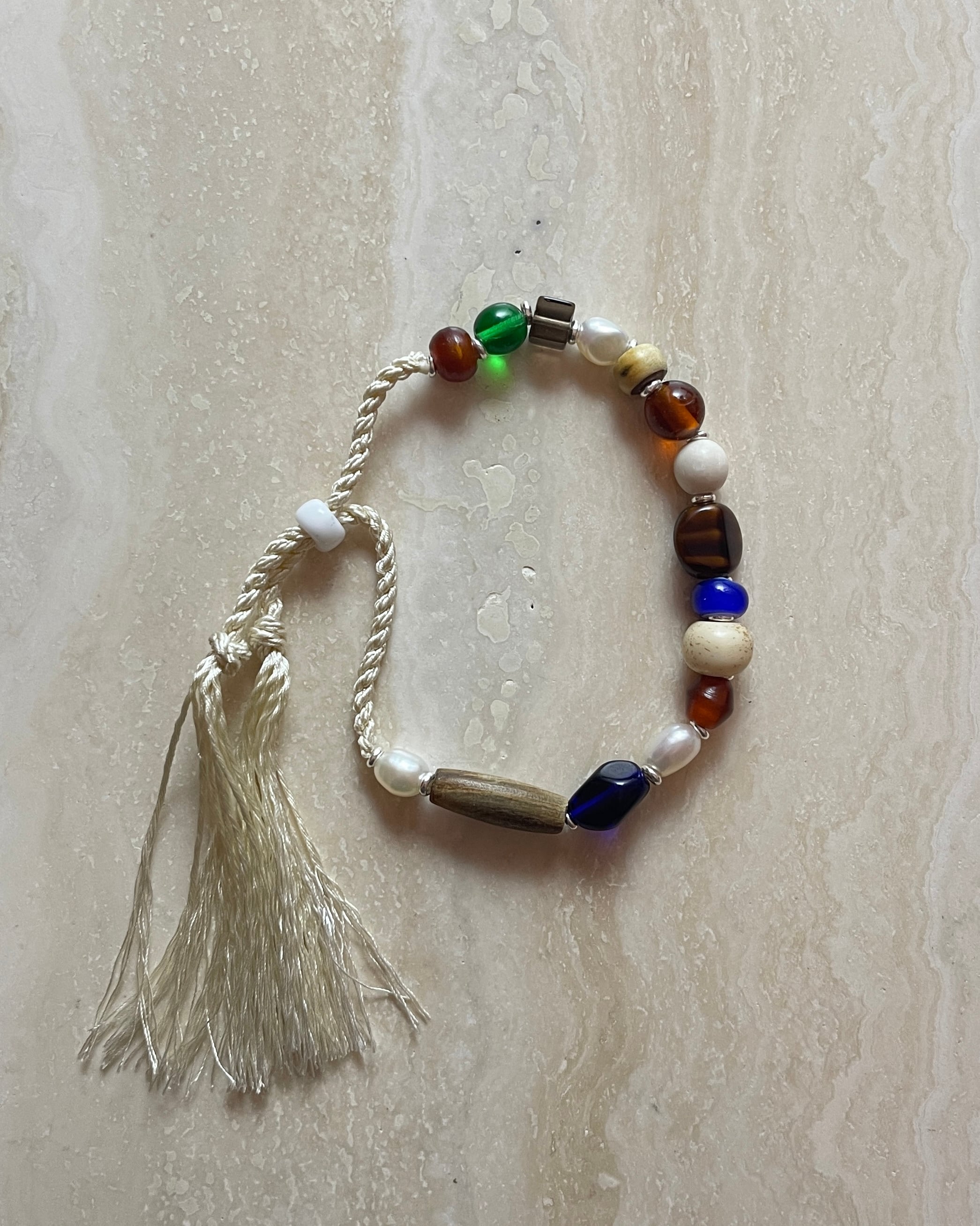 素材: ガラスビーズ / ベネチアンビーズ / 淡水パール / シルクコード サイズ: 最長 約23cm カラー: ブラックコード×ブラック、レッド、ホワイト ホワイトコード×ベージュ、ブルー、グリーン、ホワイト 腕周りは調整可能な仕様となっています。 カラフルで様々な形のビーズを組み合わせたモダンなデザイン。 お手持ちのブレスレットとの重ね付けとしてもお楽しみください。