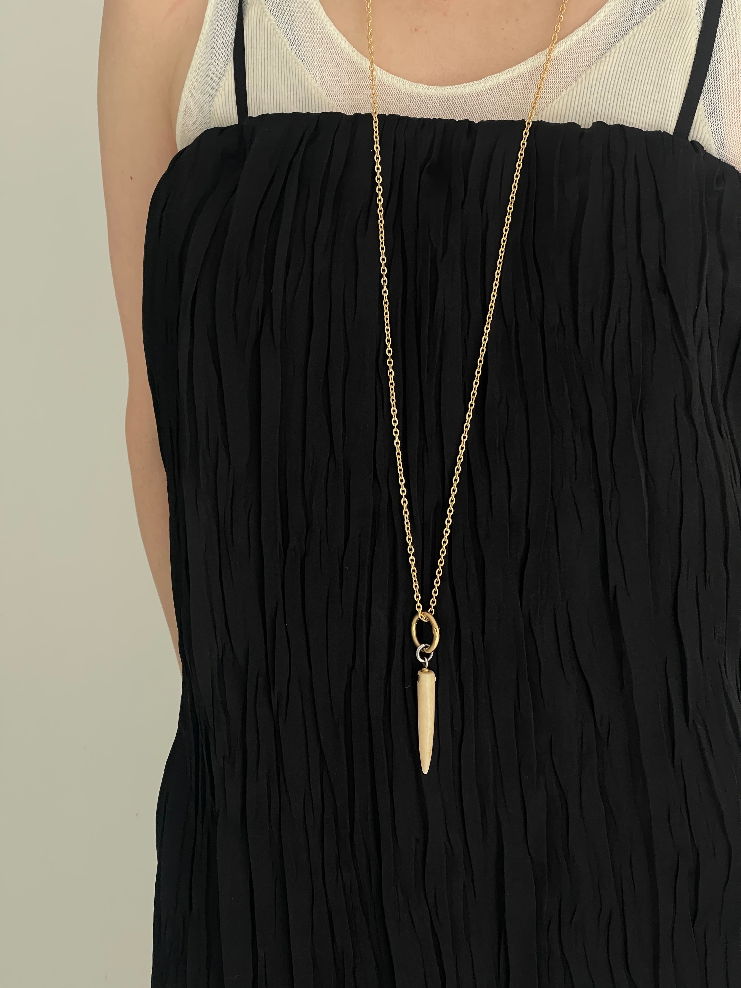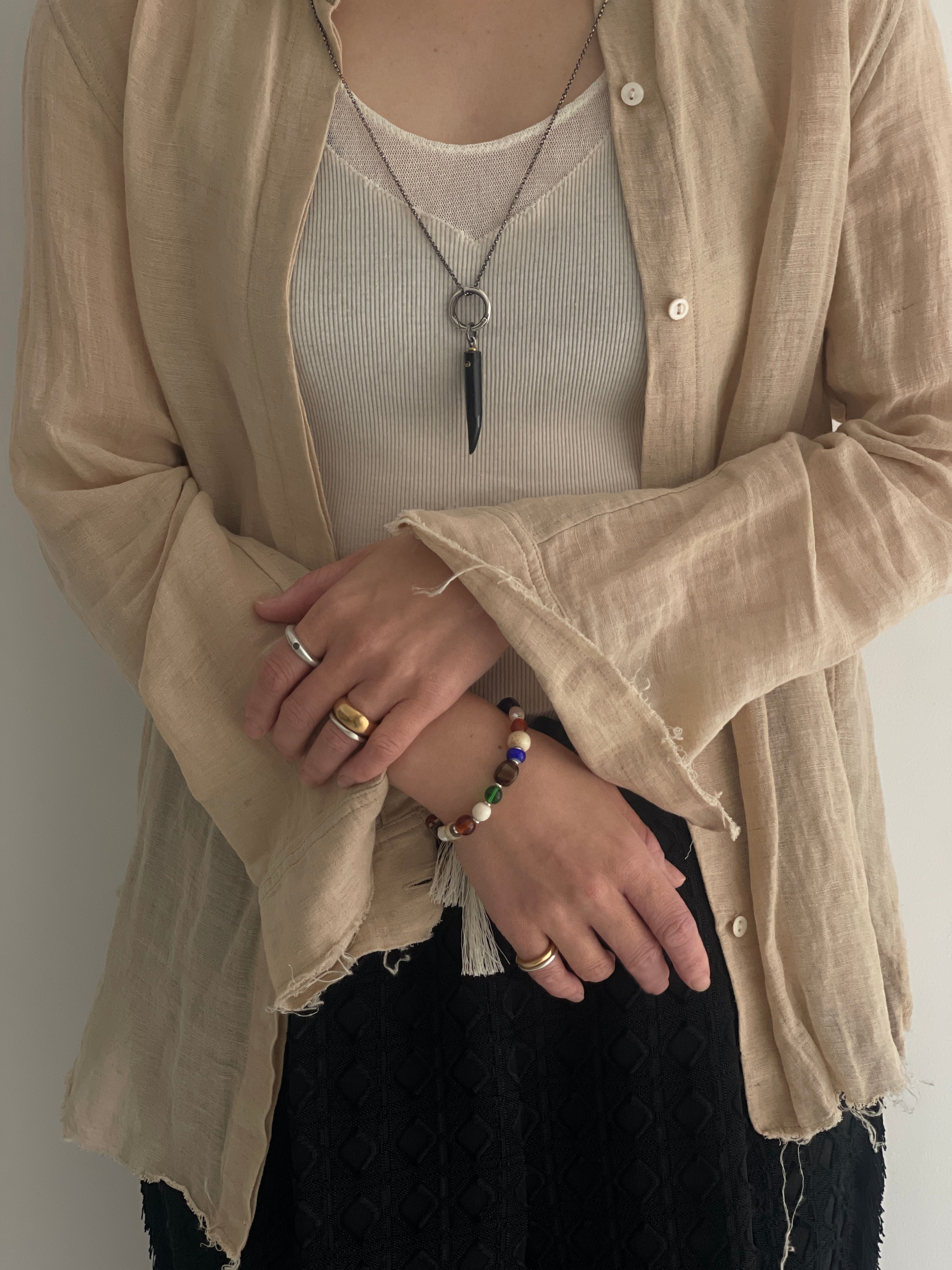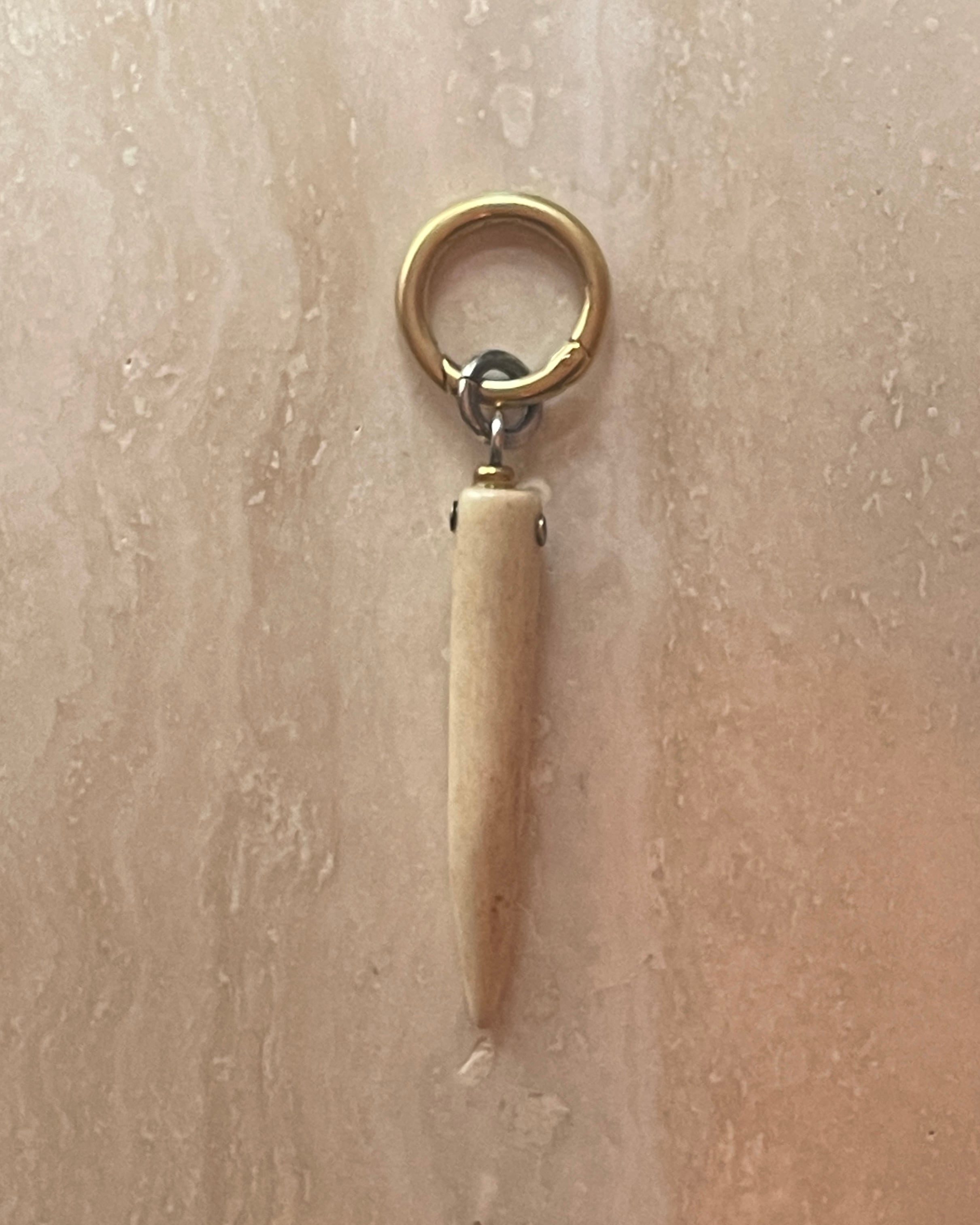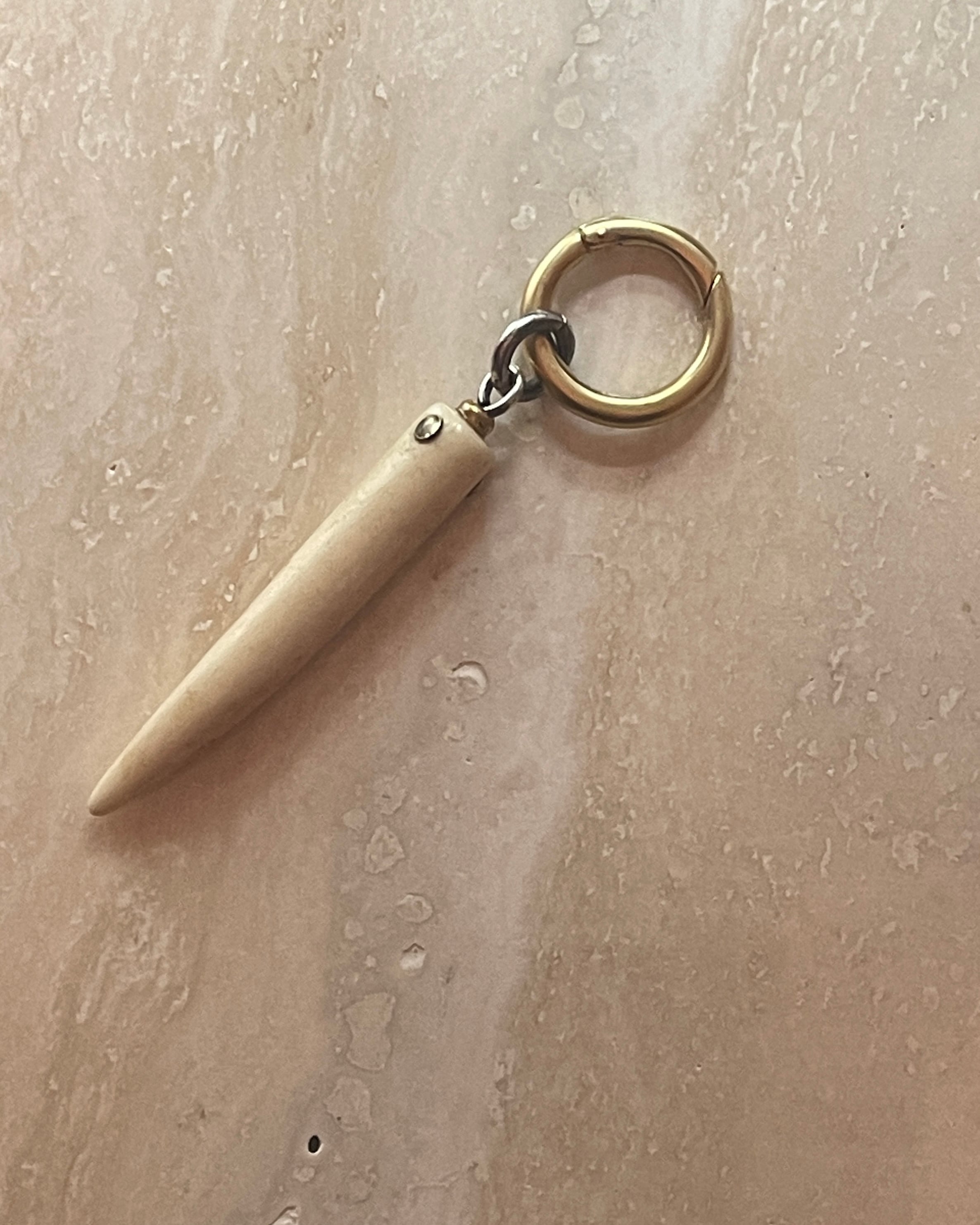 素材: 水牛のツノ / SV925+GP / SV925 サイズ: カラビナ込 77mm / カラビナ約20mm 好きなチェーンやコードを通してネックレスや、バッグにチャームとしても使えるTOPです。 リング部分はカラビナ仕様なので、取り外してサイズの合うフープピアスに掛けることも可能なマルチで遊べるアイテムです。