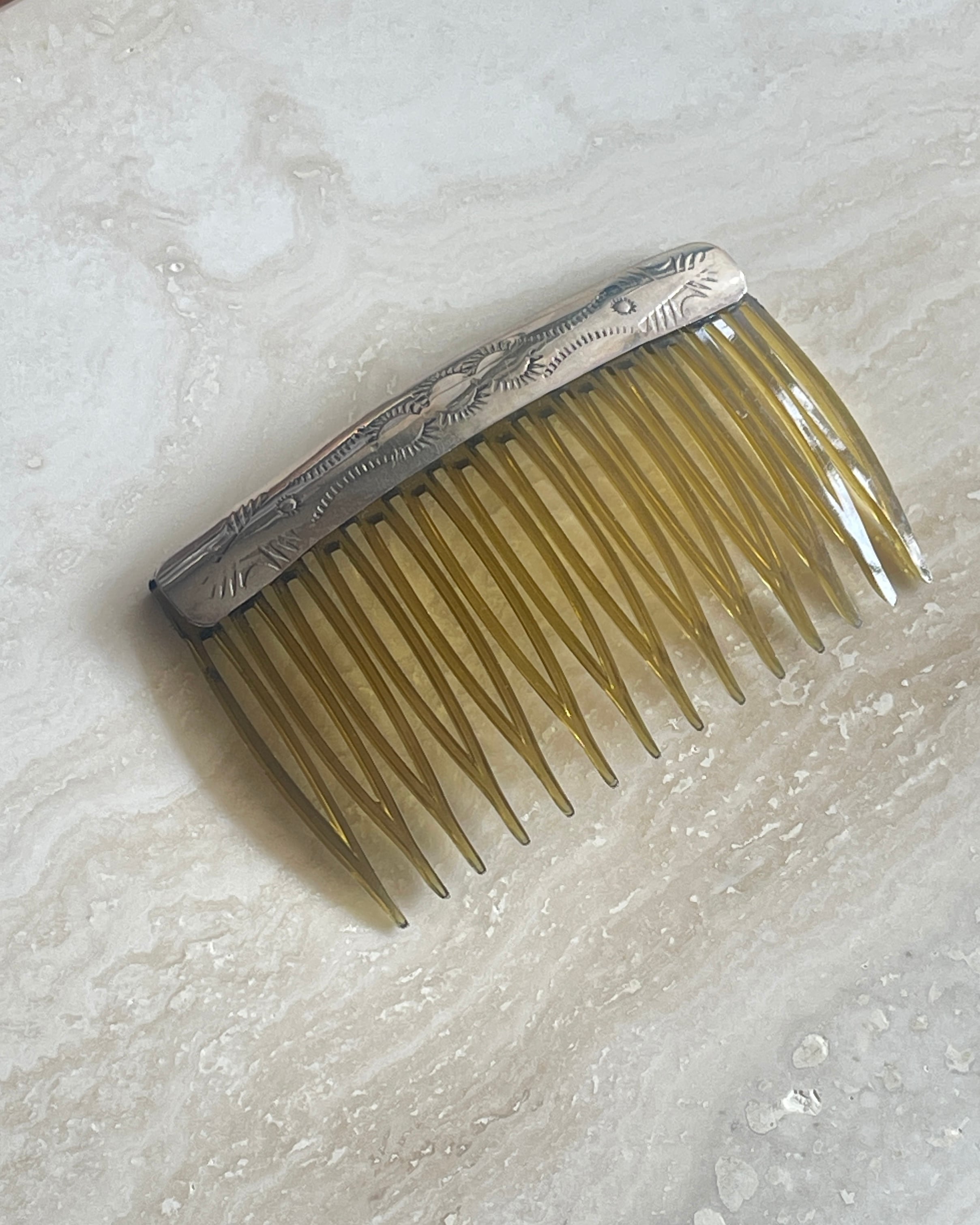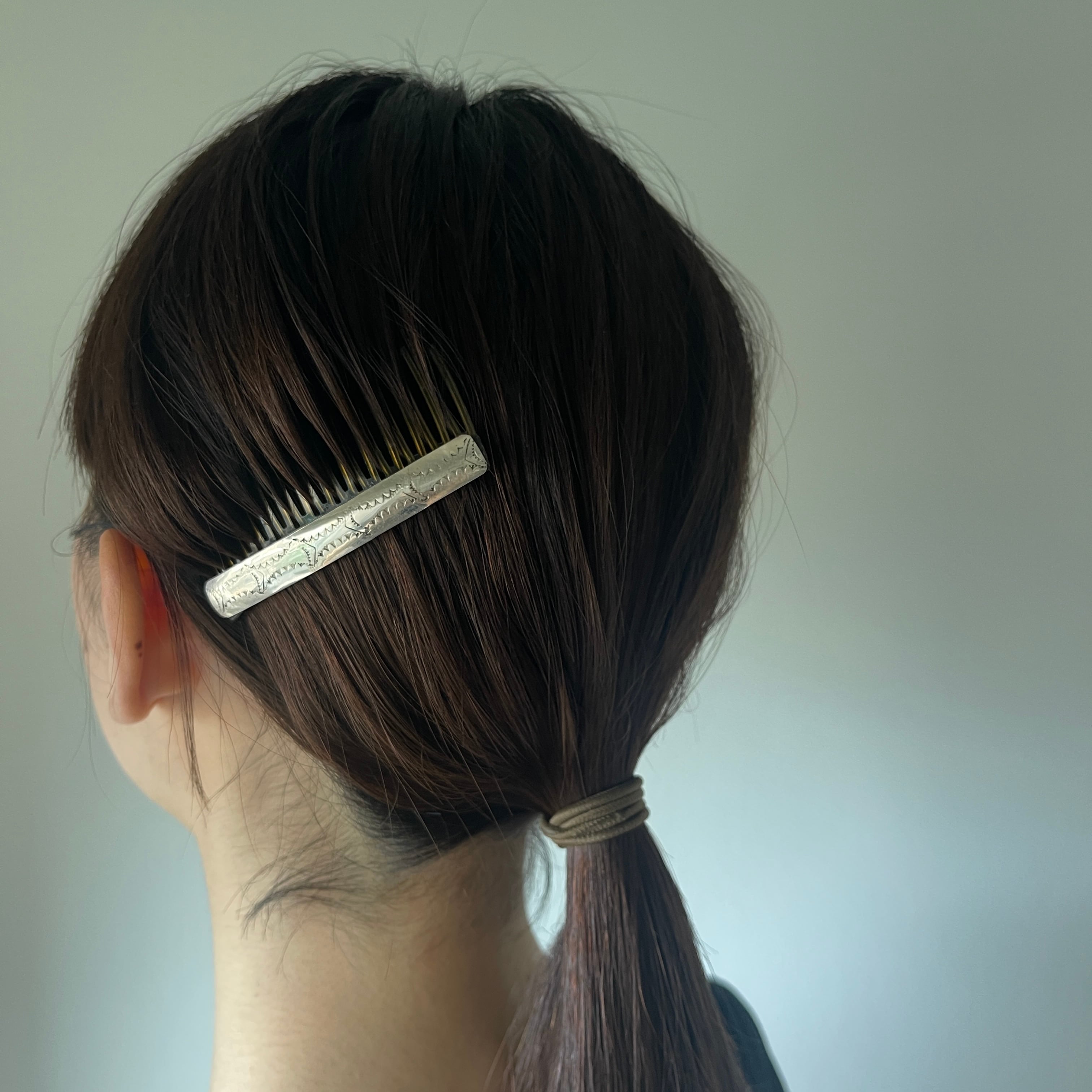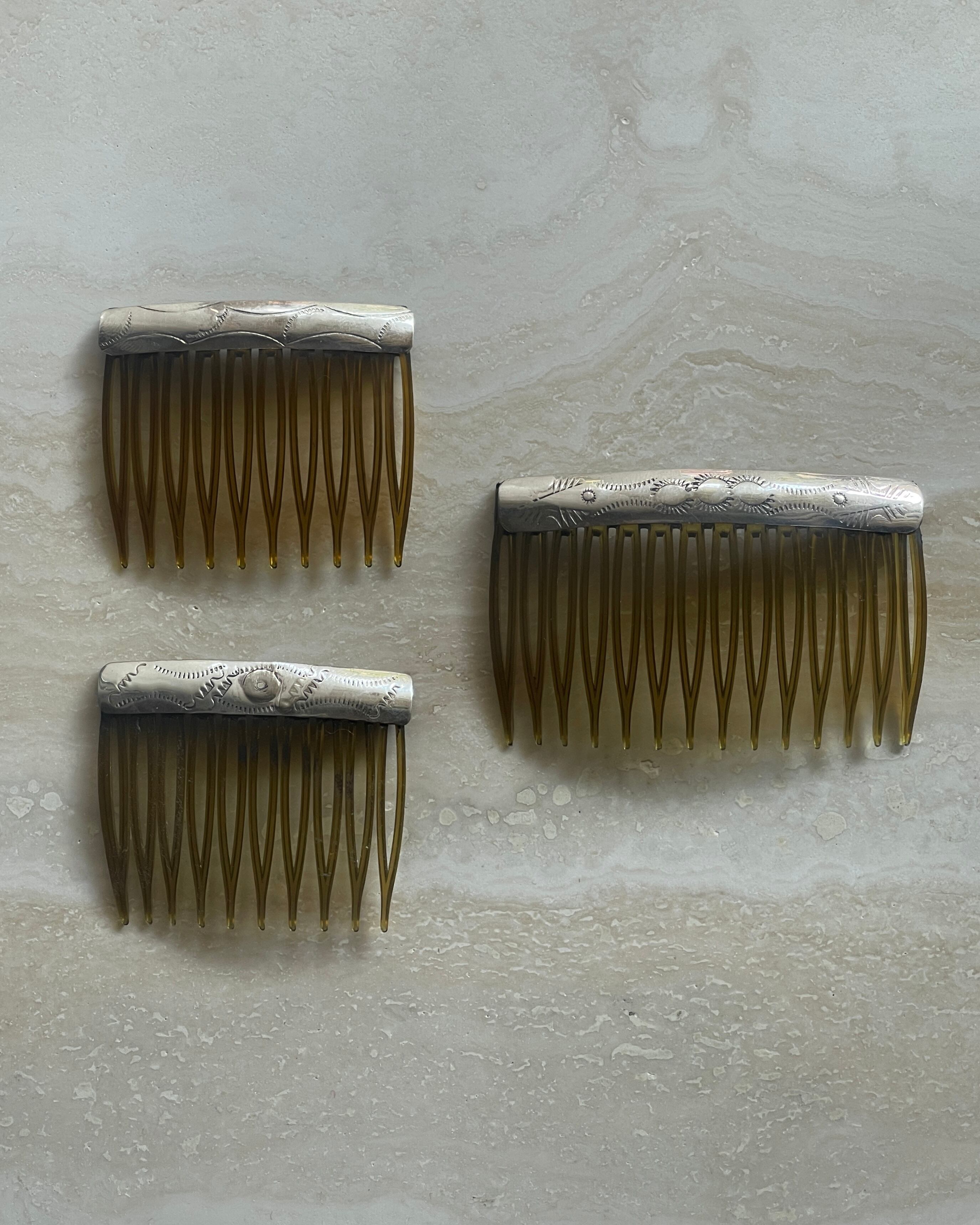 素材:スターリングシルバー / プラスチック サイズ: 約7cm×4.3cm 現代のネイティブアメリカンによるハンドメイドのヘアコームになります。MとSを一緒に付けたり、ひとつでシンプルにまとめたり、お楽しみください。