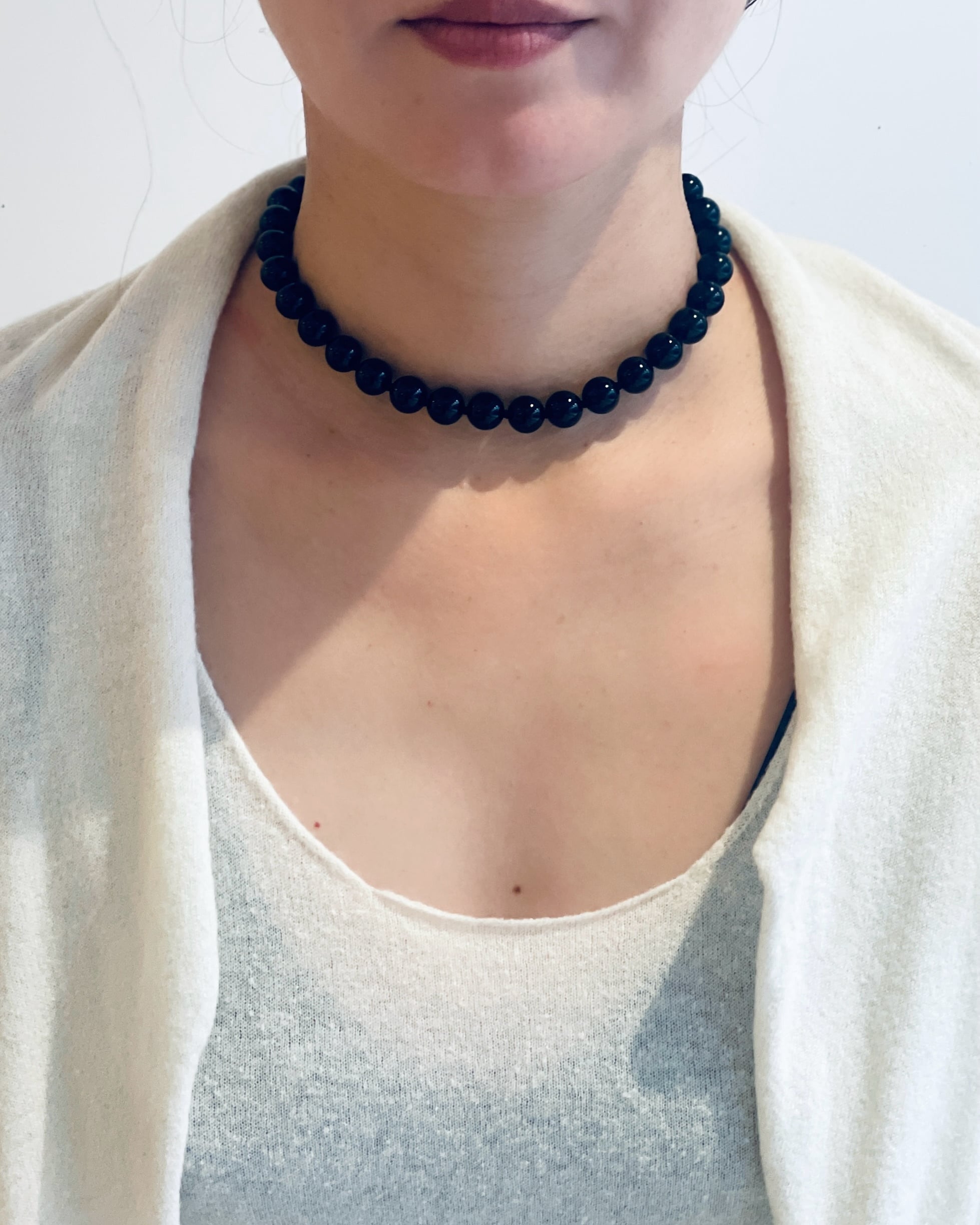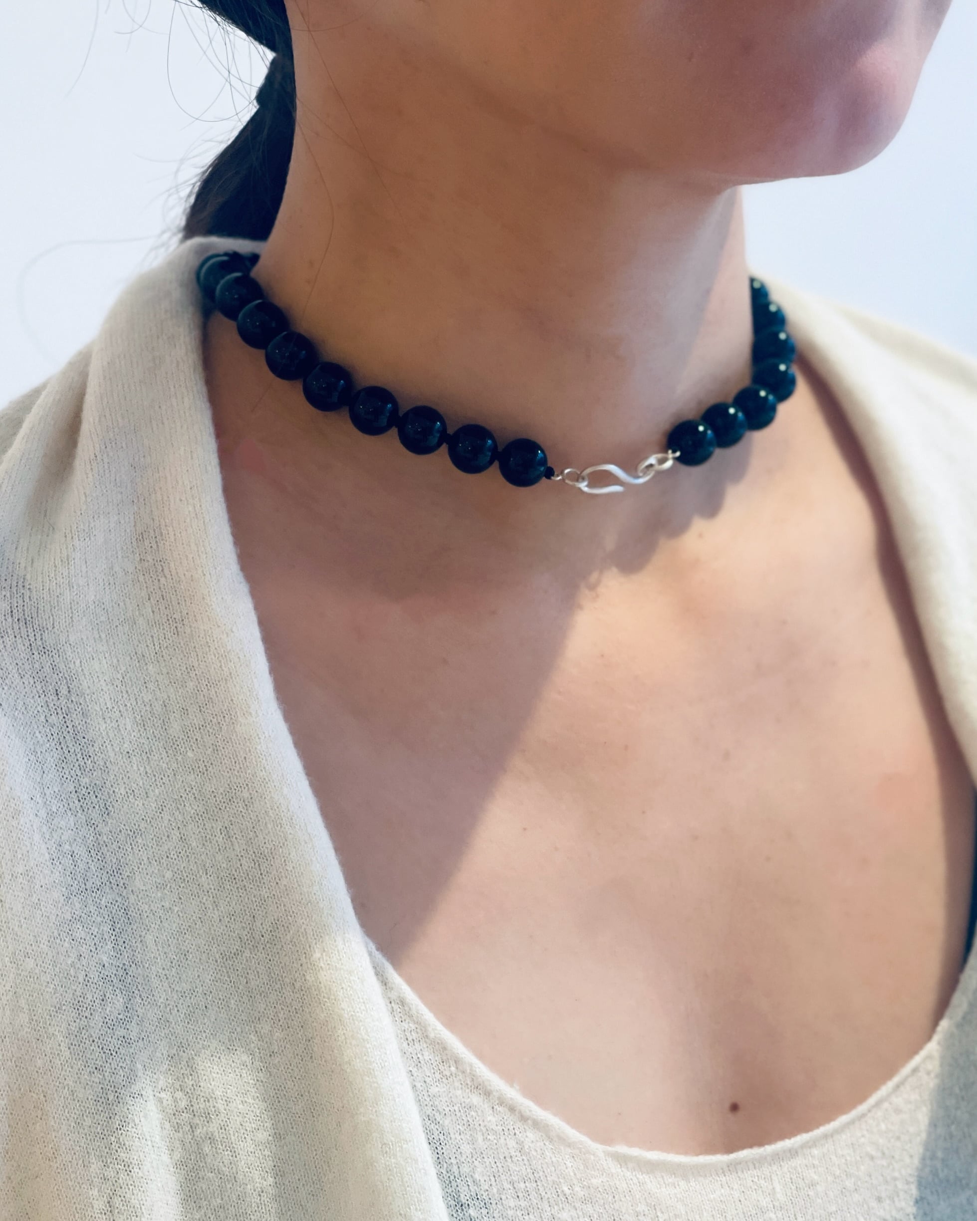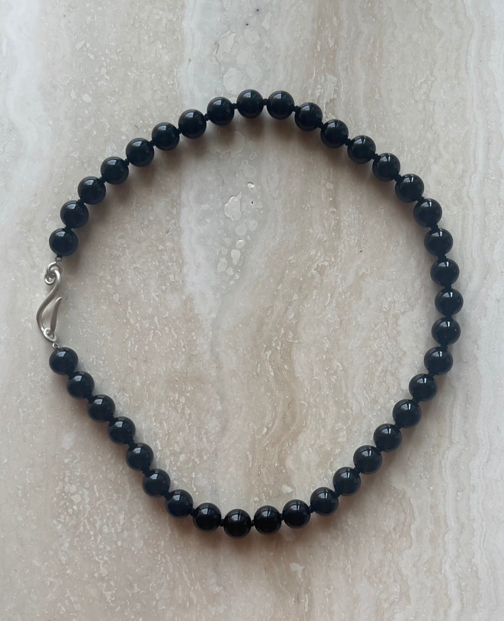 黒く艶のあるオニキス珠を黒糸でノット仕上げにしたネックレス。シーズン問わず、アクセントになるアイテムです。